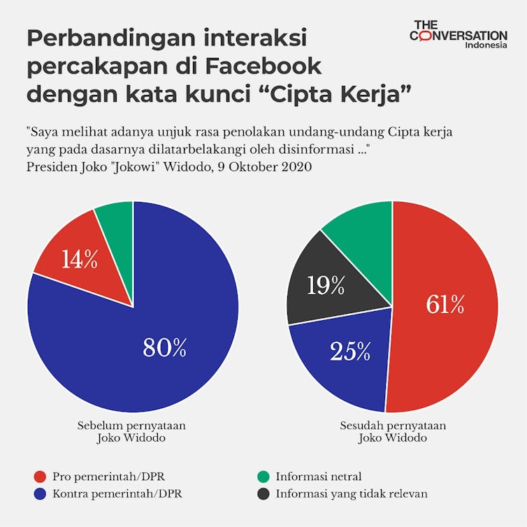 Data dari CrowdTangle—alat yang merekam percakapan publik yang dimiliki dan dioperasikan oleh Facebook, seminggu sebelum pernyataan presiden terdapat 15.819 percakapan dengan kata kunci “cipta kerja” di Indonesia.